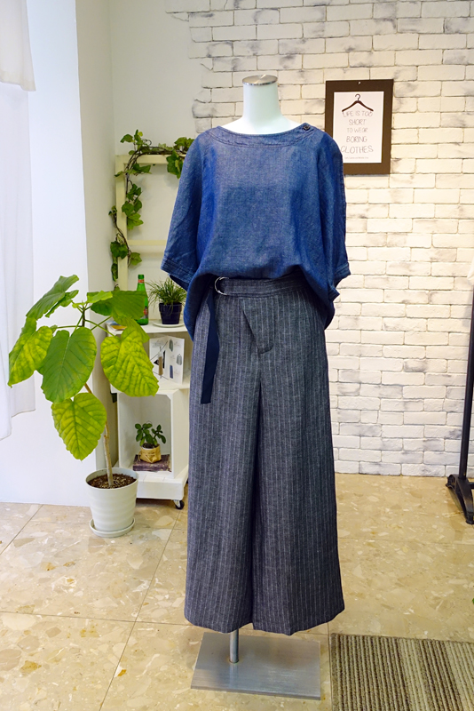 この夏注目 ! ウエストマークのワイドパンツ 今日の逸品は、ウエストマークのパンツ麻100%ですが、ソフトな仕上げになっています パンツに付いているグログランのベルトに合わせてトップスの色をコーデしましたブラウスも麻100%素材です パンツのお色違いは、まず“生成り”トップスは、黒のカットソーでメリハリを付けて グレーには、同じく麻100%のインディゴブラウスを